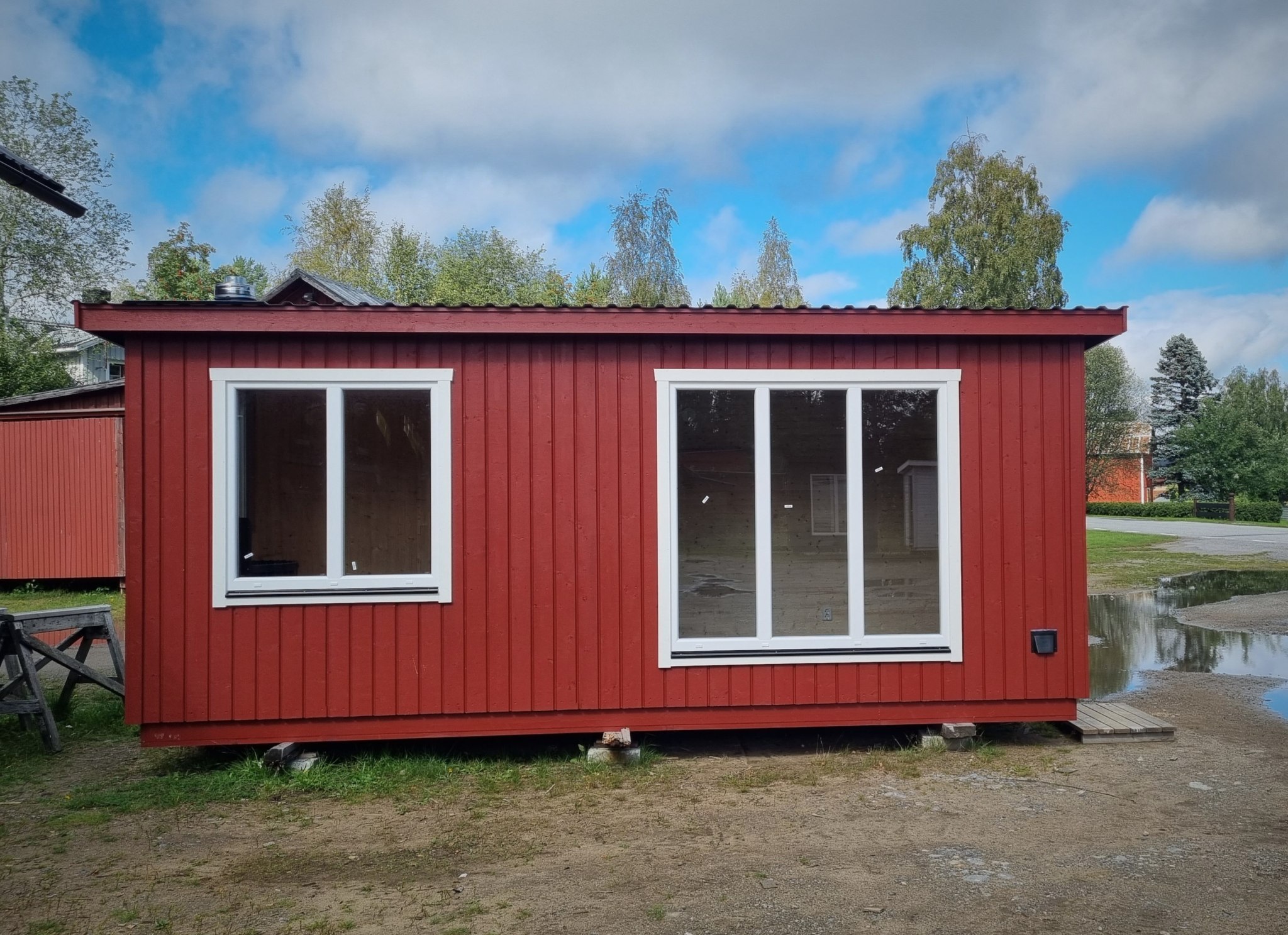Basturummet har två fönster av härdat glas: ett stort fönster fram med mittstolpe, 1200×1200 mm, som ger ett härligt ljusinsläpp, och ett mindre liggande fönster på gaveln, 500×1200 mm, som är öppningsbart i överkant.